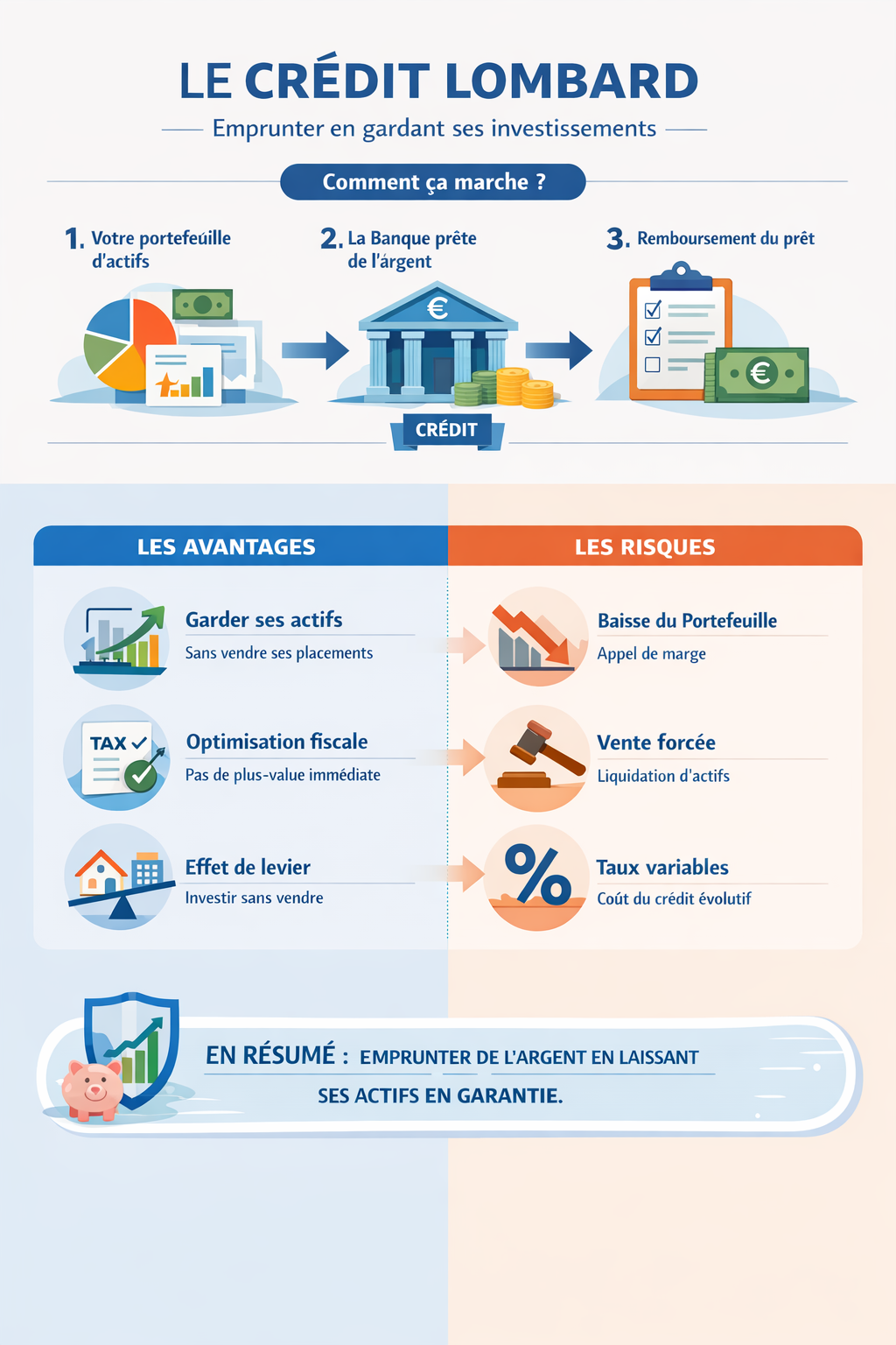 Qu’est-ce qu’un crédit lombard ?Comment fonctionne le crédit lombard ?Pourquoi utiliser un crédit lombard ?Quels actifs peuvent être utilisés en garantie ?Quels sont les risques du crédit lombard ?À qui s’adresse le crédit lombard ?Exemple concret d’utilisation du crédit lombardCrédit lombard vs crédit classique : quelles différences ?Faut-il utiliser le crédit lombard ?En brefLe crédit lombard est un outil encore méconnu du grand public, mais largement utilisé en gestion de patrimoine. Il permet de mobiliser des liquidités sans vendre ses actifs financiers, tout en conservant une exposition aux marchés. À la croisée du financement et de la stratégie patrimoniale, il constitue un levier puissant… à condition d’en maîtriser les mécanismes.