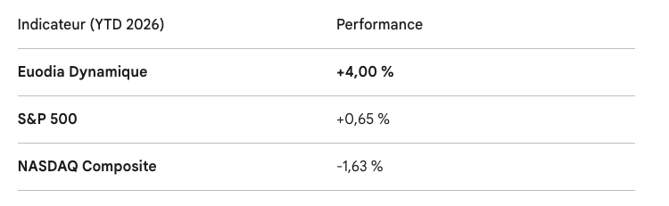 Une stratégie d'Asset Management fondée sur l'agilitéPerformances 2026 : Euodia Dynamique surperforme les indices de référencePourquoi intégrer Euodia Dynamique à votre portefeuille ?📅 L'avis de l'expert : L'importance du timing en 2026Dans un environnement de marché de plus en plus volatil en ce début d'année 2026, la gestion passive traditionnelle montre parfois ses limites. Pour les investisseurs en quête de croissance, la question n'est plus seulement d'être exposé au marché, mais de savoir s'en extraire ou s'y renforcer au bon moment.